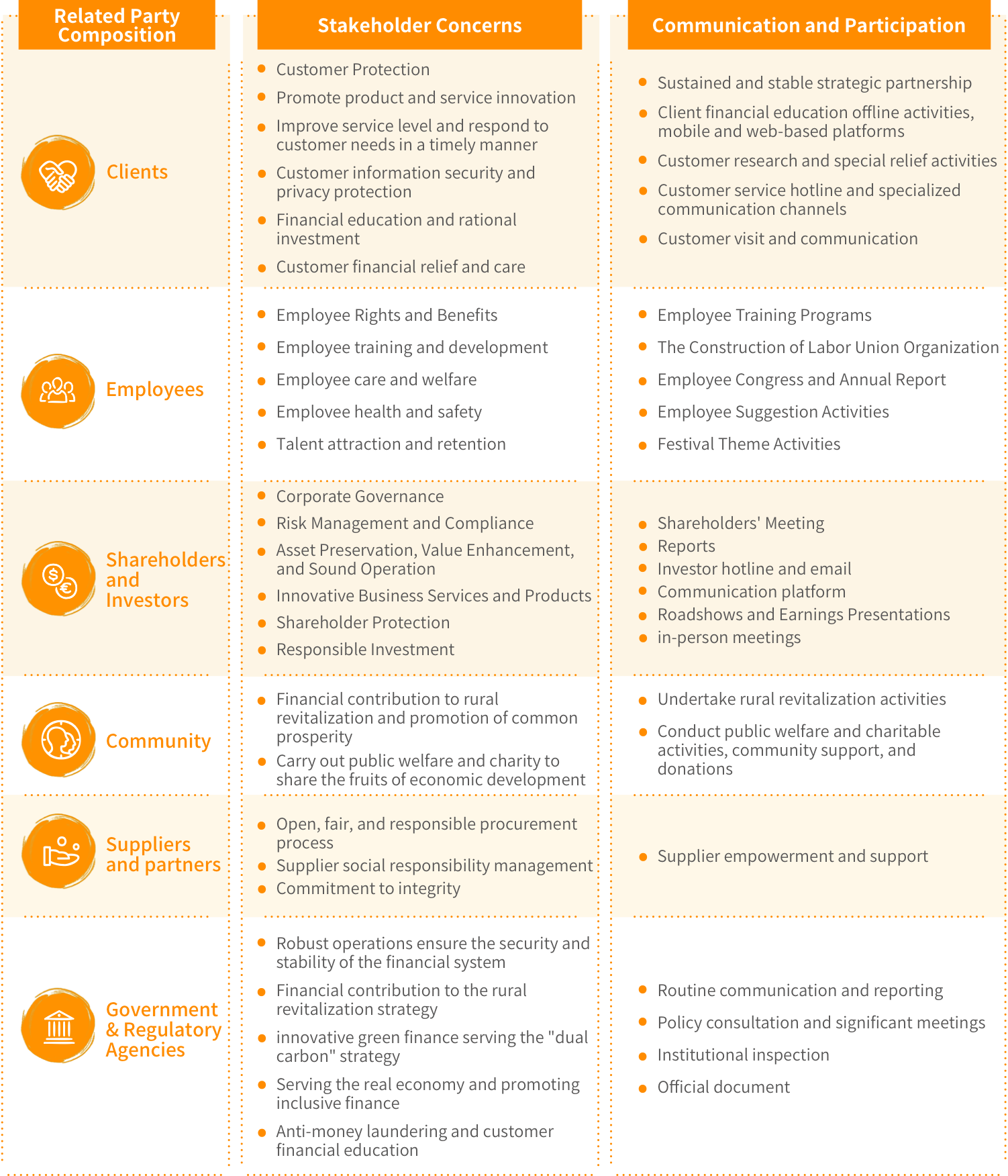 The Company attaches great importance to communication and exchange with stakeholders, focusing on sustainable development issues of concern to six major stakeholders: customers, employees, shareholders and investors, communities, government and regulatory agencies, suppliers and partners, and incorporating the demands of each stakeholder into the operation and decision-making process through a regularized communication mechanism, so as to create value for all parties.